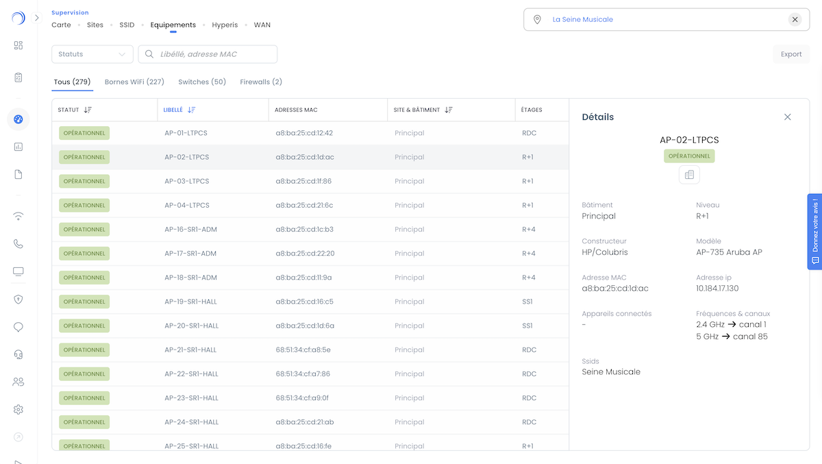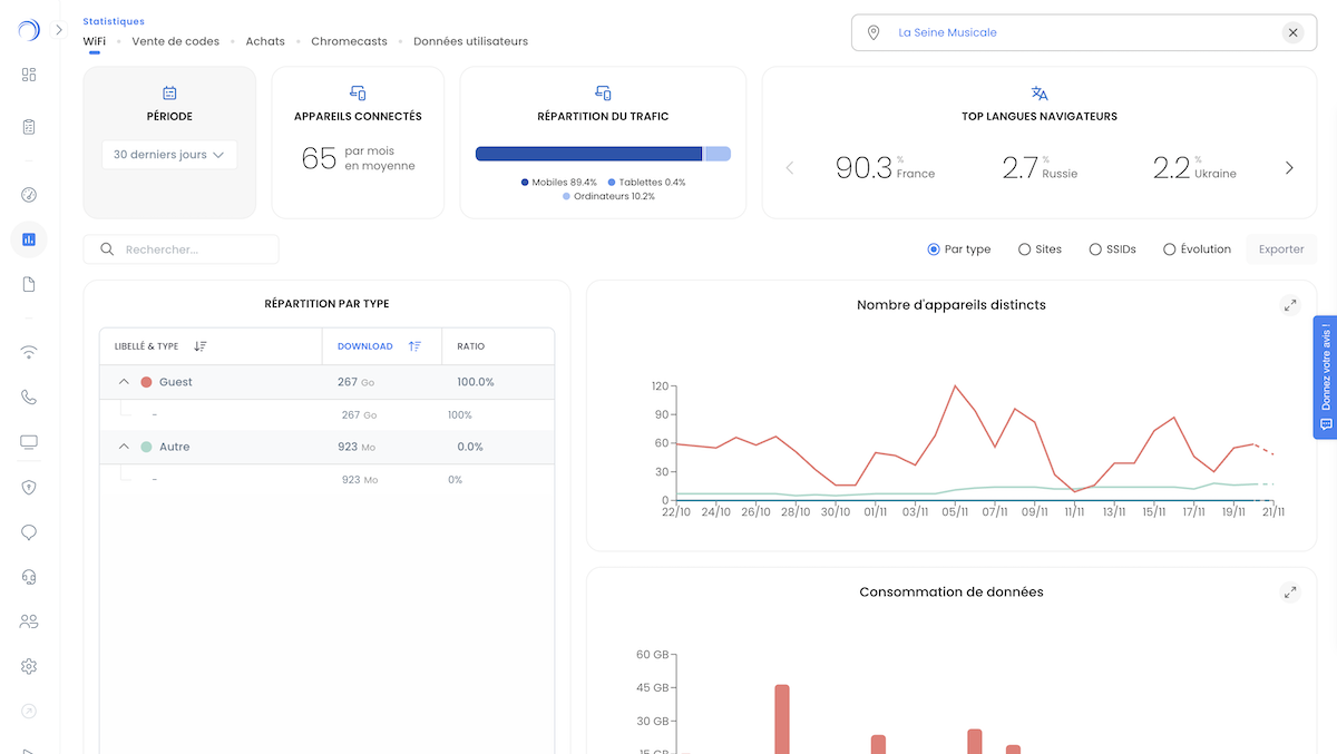 Grâce au Wifirst Center, nos clients disposent également d’une plateforme Cloud intuitive leur offrant une vision complète et en temps réel de leur réseau : états des points d’accès, niveaux de charge, qualité de service, usages visiteurs… Une transparence totale qui permet à chacun de garder le contrôle et d’exploiter pleinement toute la valeur du réseau.